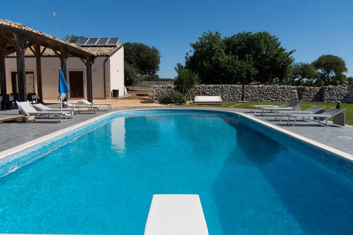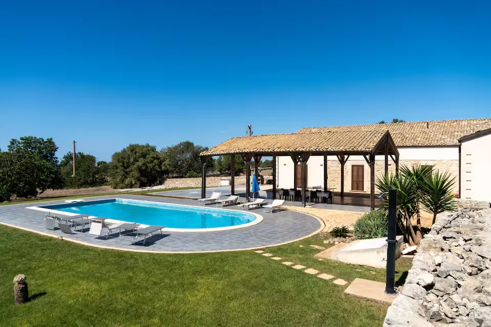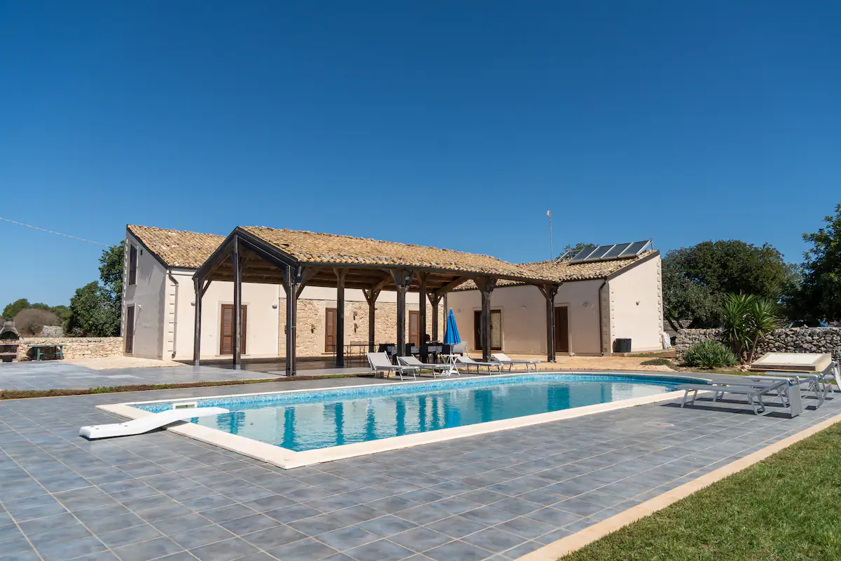 Splendida residenza recentemente ristrutturata, dotata di una grande piscina e situata a pochi km da Marina di Ragusa, immersa nella campagna ragusana tra alberi di Carrubo e muretti a secco.